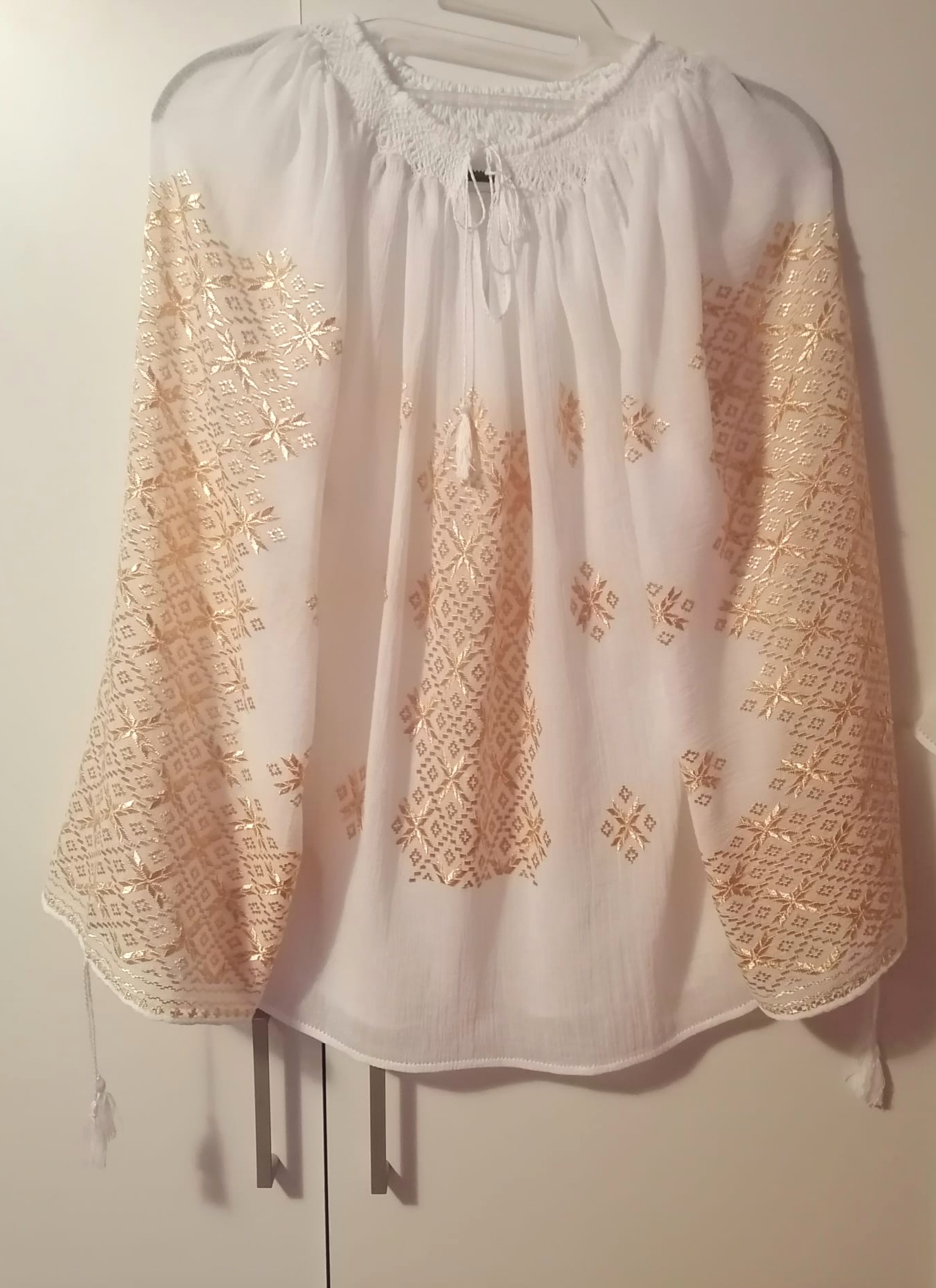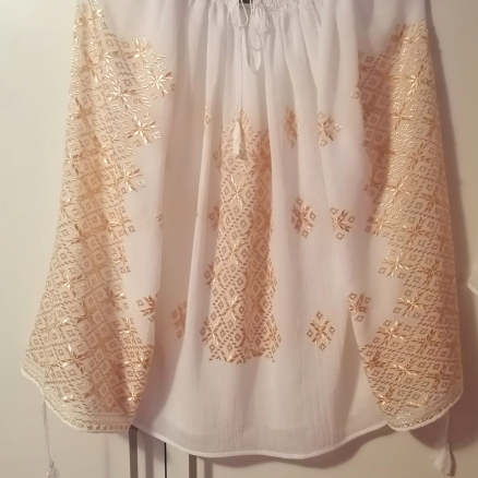 Ie realizată exclusiv manual pe pânză topita 100 %bumbac, cusatura, modelul este realizat cu fir de matase de cea mai bună calitate, foarte fin,strălucitor, care nu se scamoseaza la spălare. Se spală fără probleme la 30grade,panza nu întra la apa, marimea inițială rămânând aceeași și după spălare.